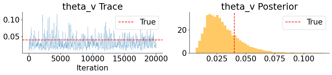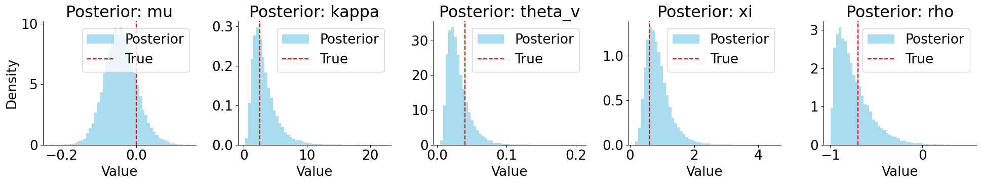 Despite this asymmetry, the posterior is well centered: the true value lies comfortably within the 80% credible interval, and the posterior median slightly overestimates \(v_T\), reflecting residual uncertainty in the volatility-of-volatility parameter. The long right tail highlights the fact that high terminal volatility scenarios remain plausible given the data, a feature that would be difficult to capture with moment-based or Gaussian approximations. Overall, this marginal illustrates how the hybrid NPE + PF approach preserves uncertainty in both parameters and states without collapsing onto a single volatility trajectory.