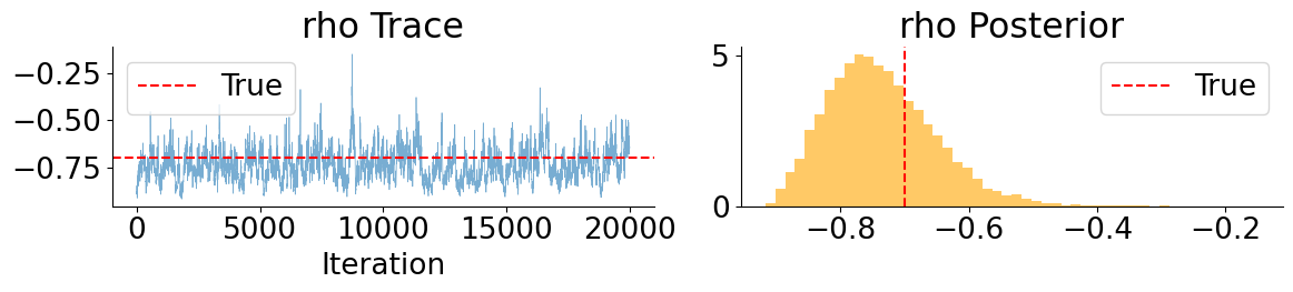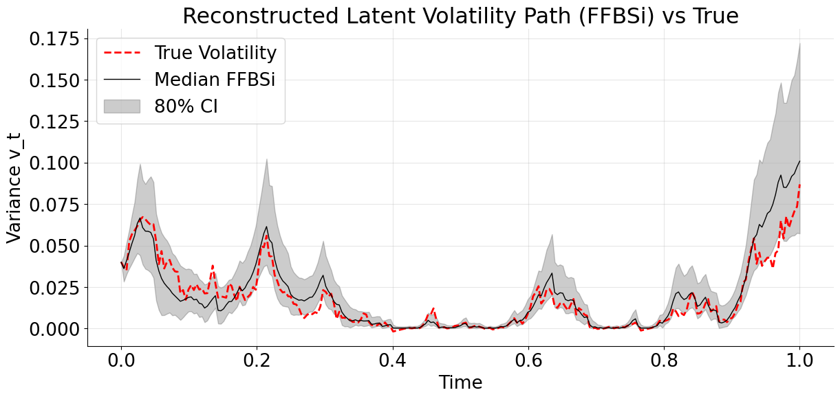 The median FFBSi trajectory follows the level, timing, and regime changes of the true latent variance meaningfully. The 80% credible interval behaves sensibly, widening when volatility is high and tightening in calm regimes. The true path stays inside the band most of the time, without the band being trivially over-wide. The variance increases sharply toward the end, but this is a realistic behavior at the end-of-horizon where information progressively disappears.