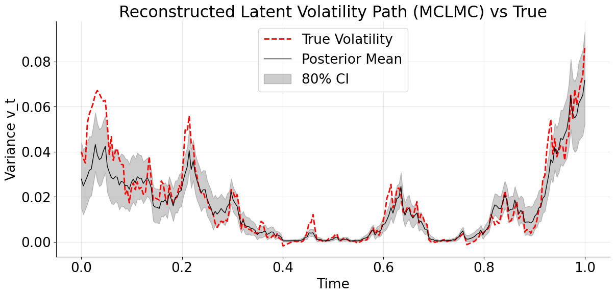 The MCLMC-smoothed volatility path correctly captures the temporal structure of volatility regimes, but exhibits systematic amplitude damping, with peaks consistently lower than the true latent path. This behavior mirrors the downward bias observed in the inferred volatility-of-volatility parameter and reflects the tendency of Euler-discretized gradient-based inference to favor smoother latent trajectories when discretization error is treated as exact. Also note that the 80% credible interval tightens in low-vol regimes and widens during spikes, with no pathological overconfidence.
