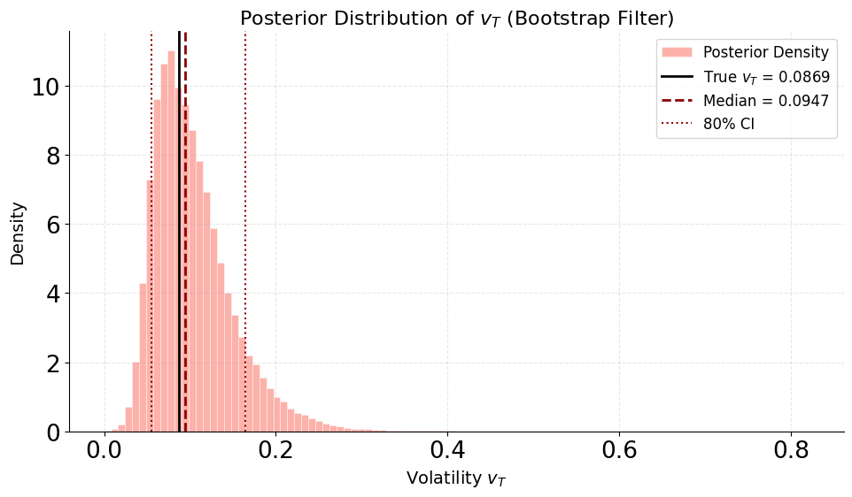 The result is a large pool of weighted particles approximating the full marginal posterior of the final volatility \(p(v_{T} | S_{0:T})\), accounting for parameter uncertainty.